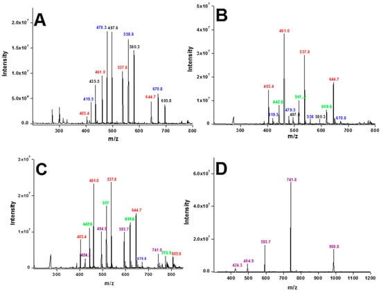 Serum stability analyses by mass spectrometry. Analyses of peptides and degradation products were performed after (A) 5 min, (B) 20 min, (C) 30 min, and (D) 120 min of incubation in human serum. Molecular ions: intact (p-BthTX-I)2, black; (p-BthTX-I)2 minus one Lys residue, blue; (p-BthTX-I)2 minus two Lys residues, red; (p-BthTX-I)2 minus three Lys residues, green; and (p-BthTX-I)2 without four Lys residues, purple.