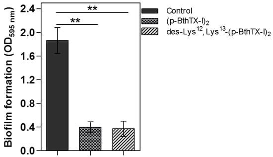 Biofilm eradication activities of (p-BthTX-I)2 and des-Lys12/Lys13-(p-BthTX-I)2. S. epidermidis ATCC 35984 growth observed after treatment with the peptides at 512 µM (** p < 0.01). The columns represent mean ± standard deviation (SD) of 16 replicates for each treatment.