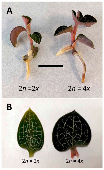 Growth and morphology of 2x and 4x plantlets in Anoectochilus formosanus (The scale bar is fitting for all figures. Bar = 2.5 and 1.0 cm for Figure 3A and 3B, respectively). (A) Plantlets; (B) Leaves.