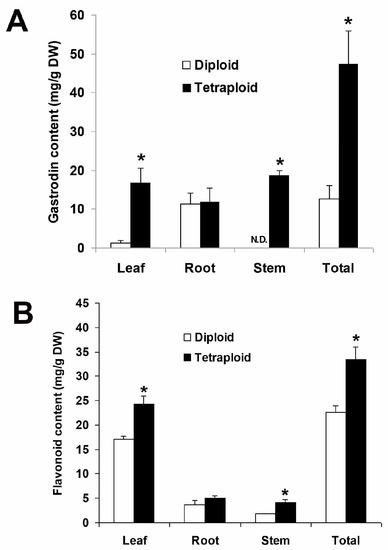 Tetraploidy could enhance the production of bioactive compounds via heritable genetic variation or overexpression of relative biosynthesis pathways, e.g., the tropane biosynthetic pathway for scopolamine production in Hyoscyamus muticus [34,35]. The tetraploid of A. formosanus had a significantly higher content of gastrodin in the leaf, stem, and the whole plants. Therefore, here we suggest that the tetraploid may possess a higher activity of phenolic glycoside biosynthesis and consequently could accumulate a higher content of gastrodin. In previous reports, there were marked differences in flavonoid accumulation in relation to ploidy level [35,36]. A similar result was also found in this present study, the tetraploid had a significantly higher total content of flavonoids than the diploid in A. formosanus.