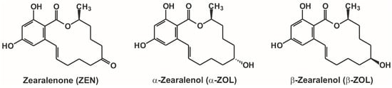 Chemical structures of zearalenone, α-zearalenol, and β-zearalenol.