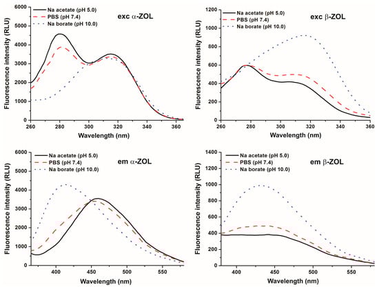 Fluorescence excitation (top) and emission (bottom) spectra of 20 μM α-ZOL (left) and 20 μM β-ZOL (right) in 0.05 M sodium acetate (pH 5.0), PBS (pH 7.4), and 0.05 M sodium borate (pH 10.0) buffers (λexc = 315 nm; λem = 455 nm).