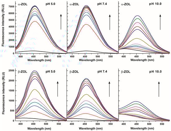 Emission spectra of ZOLs were recorded using 315 nm as the excitation wavelength. At pH 5.0 and 7.4, the emission maximum of both ZOLs was at approximately 455 nm (Figure 2, bottom). The intensity of the emission maximum of β-ZOL was much lower than that of α-ZOL at both pH values. In contrast, the emission signals increased and a marked blueshift was observed in the fluorescence emission wavelength maximum of both α- and β-ZOLs at pH 10.0 (Figure 2, bottom), as the emission maximum was at approximately 410 nm. These data are in good agreement with previous results observed with ZEN [5], and are most likely ascribable to spectral changes resulting from the deprotonation and, therefore, the ionization of ZOLs, similarly to the parent compound.