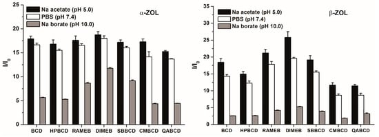 Fluorescence enhancement (I/I0) of α-ZOL (2 μM; left) and β-ZOL (2 μM; right) in the presence of 2 mM CD concentration in 0.05 M sodium acetate (pH 5.0), PBS (pH 7.4), and 0.05 M sodium borate (pH 10.0) buffers (λexc = 315 nm, λem = 455 nm).