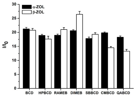 Fluorescence enhancement (I/I0) of α-ZOL (2 μM) and β-ZOL (2 μM) in the presence of 2 mM CD concentration in 0.05 M sodium acetate (pH 5.0) buffer (λexc = 275 nm, λem = 455 nm).