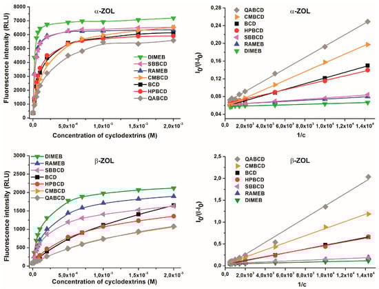 where I0 and I denote the fluorescence emission intensities of ZOLs in the absence and in the presence of CDs, respectively; [CD] is the molar concentration of the host molecule, while A is a constant and n is the number of binding sites.