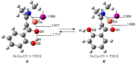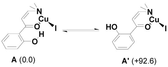Subsequently, we used electrospray ionization high resolution mass spectrometry (ESI-HRMS) to monitor the reaction. The peak at 254.0230 (m/z, [A − I]+, please see Supplementary Materials Figure S3) corresponding to the coordination of L to CuI gave sufficient evidence for the formation of a catalyst (For more details see, Supporting Information) [25,26,27]. In addition, the DFT calculation also confirmed two possible isomeric species in the reaction mixture (Scheme 4). The isomer bearing an intramolecular hydrogen bond was named intermediate A, and another was named intermediate A’ (Figure 1). The DFT calculations indicated that the formation of intermediate A (0.0 kJ/mol) was more favorable than the formation of intermediate A’ (92.6 kJ/mol). The intermediate A was considered as the intermediate for the nucleophile coordination step. Thus, the hydroxyl group in L is likely to enhance the ligand coordination ability.