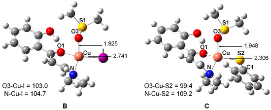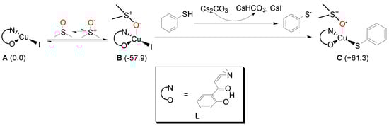 It has been reported that the S atom easily coordinates with the Cu (Scheme 5) [28,29,30]. The coordination of DMSO with intermediate A resulted in the formation of intermediate B ([B − I]+, m/z = 332.0387, please see Supplementary Materials Figure S4) [31,32]. It should be noted that in this step we only considered DMSO as a neutral nucleophile. The free energy change value was −57.9 kJ/mol, which indicatesthat the reaction is a favorable thermodynamic process. Cs2CO3 in DMSO readily deprotonates thiophenol to provide thiophenolate [33,34]. Consequently, ligand exchange occurred before the proton abstraction was identified by the DFT calculations (Figure 2). The structures of intermediates B and C ([C + H]+, m/z = 442.0557, please see Figure S5) were identified by DFT calculation (Figure 2).
