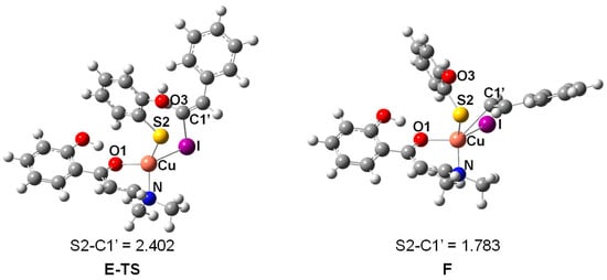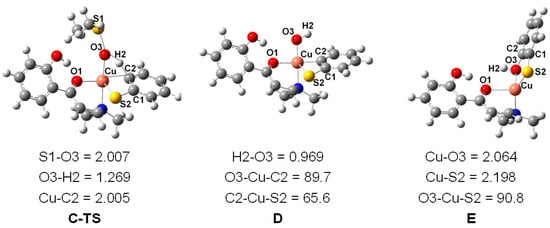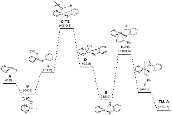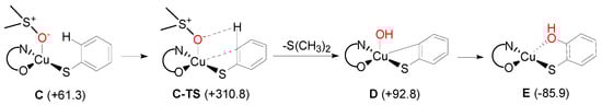 The intermediate C reacted with aryl thiols, producing the five-coordinate CuI intermediate D ([D + Na]+, m/z = 402.0201, please see Figure S6) via proton abstraction (Scheme 6). Interestingly, the DFT calculations indicated that the transition state C-TS existed, and also showed that proton abstraction was a highly endothermic process. Under the influence of Cu, DMSO became very unstable (Figure 3). Then, dimethyl sulfide became automatically dissociated [35,36,37].The four-coordinate CuI intermediate E ([E + Na]+, m/z = 402.0201, please see Figure S7) was produced by the hydroxyl group transfer. The reaction barrier of 310.8 kJ/mol in the transition state was high. However, the reaction temperature was 100 °C in our reaction system, which was sufficient to provide the energy required for this reaction. On the other hand, the ligand coordination ensured that the reaction proceeded smoothly. This transformation was also thermodynamically favorable ((−85.9) − 92.8 = −178.8 kJ/mol).