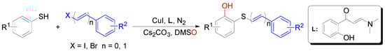 - Xu, R.S.; Yue, L.; Pan, Y.J. Regioselective copper (I)-catalyzed C–H hydroxylation/C–S coupling: Expedient construction of 2-(styrylthio) phenols. Tetrahedron 2012, 68, 5046. [Google Scholar] [CrossRef]