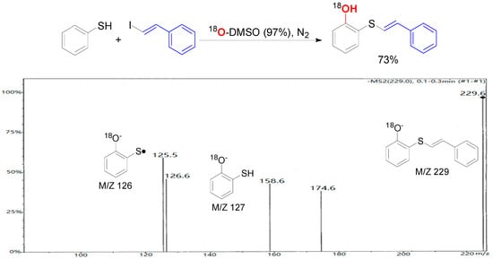 The reaction of vinyl halides with thiophenol was chosen as the model reaction (Scheme 1, n = 1). The solution dimethyl sulfoxide was identified as a critical component in C-H hydroxylation. Based on this, alabeling study was employed to investigate the possible oxygen source of the hydroxy moiety (Scheme 2). The product was inspected by ESI-MS/MS after the completion of the reaction. The results showed that the oxygen source was dimethyl sulfoxide.