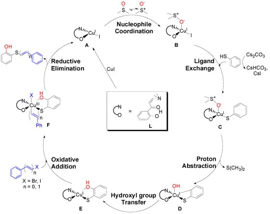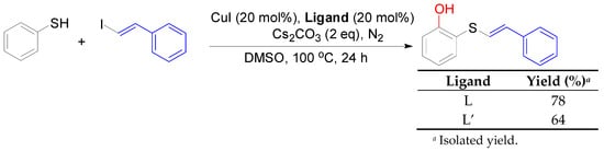 In order to investigate which segment acted as the catalyst, the thiophenol and 1-((E)-2-iodovinyl)benzene reaction was catalyzed by the enaminone ligands L and L’ (Scheme 3). Ligand A was used in the reactions which we previously reported [23,24]. They gave medium yields, indicating that the hydroxyl group may not play a role in this reaction.