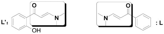 Dimethylformamide dimethylacetal (DMFDMA) (1.19 g, 10 mmol) and 1-(2-hydroxyphenyl) ethanone (1.36 g, 10 mmol) were dissolved in p-xylene (2 mL). The mixture was refluxed over a period of 10 h, during which time the formation of a yellow precipitate occurred. The precipitate was filtered out and washed with petroleum ether three times. The solid was vacuum-dried, and 1.79 g (94% yield) of a yellow solid, L ((E)-3-(dimethylamino)-1-(2-hydroxyphenyl)prop-2-en-1-one), was obtained. 1H-NMR (500 MHz, DMSO-d6):δ14.51 (s, 1 H), 7.92–7.90 (t, J = 7.5 Hz, 2 H), 7.37–7.34 (t, J = 7.8 Hz, 1 H), 6.83 (d, J = 2.0 Hz, 2 H), 5.98–5.95 (d, J = 12 Hz, 1 H), 3.19 (s, 3 H), 2.98 (s, 3 H); 13C-NMR (125 MHz, DMSO-d6): δ 191.1, 163.6, 156.7, 134.9, 129.9, 121.2, 119.1, 118.7, 90.4, 46.1, 38.6.