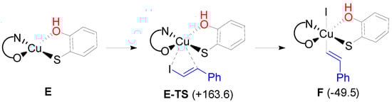 Next, intermediate E reacted with vinyl halides by oxidative addition, producing the CuIII intermediate F (Scheme 7, [F − I]+, m/z = 483.0937, please see Figure S8). The DFT calculations indicated that the transition state F-TS existed in the oxidative addition (Scheme 7) [38]. After that, the intermediate F underwent reductive elimination to obtain the product and intermediate A, which re-enters the catalytic cycle. Our calculations showed that the elimination step was largely thermodynamically favorable (Figure 4).