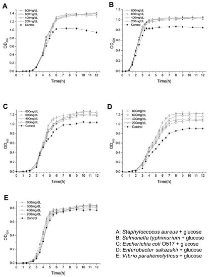 Effects of glucose on the growth of tested bacteria.
