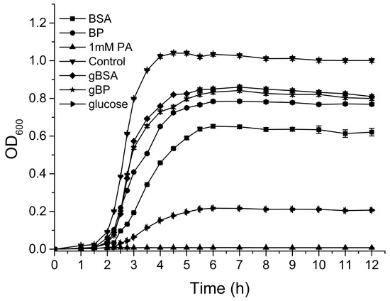 The effects of PA on the growth of SA in different culture mediums are shown in Figure 3. PA at a concentration of 1 mM completely restrained the growth of SA in the pure medium. The glucose and proteins negatively influenced the antibacterial effects of PA. Additionally, the negative influences of gBSA and gBP were stronger than those of BSA and gBP, respectively, which also supported the conclusion that the antibacterial performance of polyphenols was suppressed under hyperglycemic conditions. These results indicated that high blood glucose may create a hotbed of bacterial infection, and the hyperglycemic conditions results from diabetes are likely to suppress the antibacterial benefits of polyphenols.