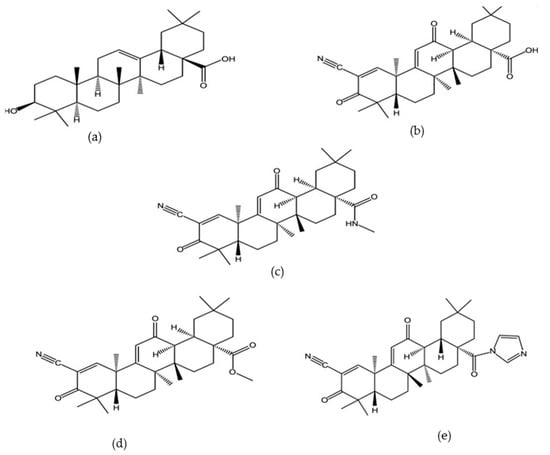 Structures of oleanolic acid and some of its derivatives (a) Oleanolic acid ] (b) CDDO (c) CDDO-Ma ] (d) CDDO-Me (e) CDDO-Im [17].