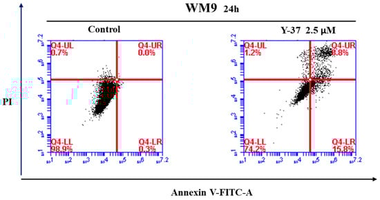 The Annexin V-FITC-A/PI apoptosis detection kit was induced to test the further role of compound 4g in inhibiting WM9 cell death (Figure 2). Before undergoing the flow cytometry, the WM9 cells were treated with 0 and 2.5 µM compound 4g for 24 h, and then Annexin V-FITC and PI were put into use. As shown in Figure 2, the WM9 cells which were treated with fangchinoline derivative 4g showed 8.8% in the early apoptosis state and 15.8% in the late apoptosis state, which is significant higher than the control WM9 cells (0.0% and 0.3% in early and late apoptosis states, respectively). The flow cytometry result showed that compound 4g could induce apoptosis in WM9 cell line.