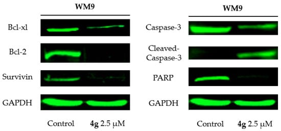 Western blot analysis was induced to elucidate the effect of compound 4g on protein levels to further expatiate how compound 4g induces apoptosis in WM9 cells (Figure 3). The Bcl-xl, Bcl-2 and Survivin display repressor activities in cell death [29]. As shown in Figure 3, 4g inhibited the Bcl-xl, Survivin and Bcl-2 expression, which is evidence of the activated mitochondrial pathway of cell apoptosis [30]. The activation of executioner from Pro-Caspase-3 to Cleaved-Caspase-3, which is also shown in Figure 3, means that apoptosis is being executed. The down-regulation of full-length PARP (the degradation of poly [ADP-ribose] polymerase), indirectly proved the up-regulation Cleaved-PARP, which could obliterate DNA repair and induce apoptosis in cells.