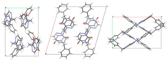 A perspective drawing of the packing arrangement of compound 3, showing the molecules’ direction along the a, b, and c axis.