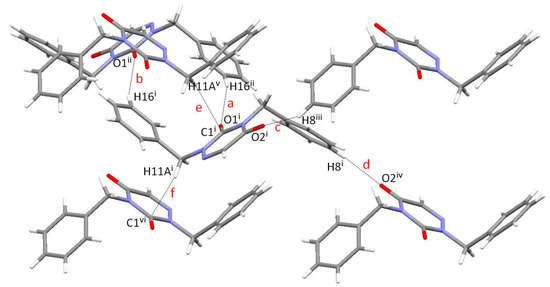 The molecular packing of compound 3 is shown in Figure 2. An analysis of the molecular packing in the unit cell reveals that there are neither classic hydrogen bond nor molecule disorder in the crystal structure of 3. The intermolecular short contacts in the molecular graphic were all obtained using the Mercury program (version 2.3, CCDC, Cambridge, UK). We note that in the unit cell each molecule is linked to five other molecules with six short contacts (Figure 3). These short contacts include weak hydrogen bond interactions (Figure 3 notation (a, b, c, d)) and C-sp2···s-sp3 interactions (Figure 3 notation (e, f)) which stabilized the crystal structure. The title molecule (i = x, y, z) atom C1–O1i linked with H16–Carii at (ii = 1 − x, −y, 1 − z) and Car–H16i linked with O1–C1ii with an identical short contacts distance of 2.656(3) Å (Figure 3 notation (a, b)). Meanwhile, the Oxygen atom C2–O2i linked with H8−Cariii at (iii = 2 − x, −1/2 + y, 1/2 − z) and Car–H8i linked with O2–C2iv at (iv = 2 − x, 1/2 + y, 1/2 − z) have a same short contacts distance of 2.566(5) Å (Figure 3 notation (c, d)). Another type of short contact involves interactions between layer and layer via O1–C1i linked with H11A–C11v at (v = 1 − x, −1/2 + y, 1/2 − z) and H11A–C11i linked with C1–O1vi at (vi = 1 − x, 1/2 + y, 1/2 − z) with an identical contact distance of 2.771(4) Å (Figure 3 notation (e, f)). The bonding environment of carbon C1i is in a π-deficient 1,2,4-triazinone ring and also attaches with oxygen O1i, resulting more positive charge in the C1i (C-sp2), which forms a short contact with H11A−C11v (s-sp3). Another possible interpretation is that the C11–H11A···C1 involves an sp3 C atom and likely exhibits the observed motif because of close packing principles rather than some cohesive interaction.