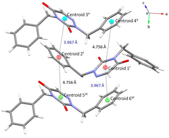 In addition to the above three types of short contacts, it is worth noting that the crystal structure is further stabilized by weakly π···π stacking interactions (see Figure 4). The centroid 1i (defined by atoms N1N2N3C1C2C3 of the molecule 3, i = x, y, z), contacts with the centroid 4v (defined by atoms C12–C17 of the upper layer molecule, v = 1 − x, −1/2 + y, 1/2 − z) with a π···π stacking interactions distance 4.756 Å. Meanwhile, the centroid 2i (atoms C12–C17) contacts with centroid 5vi (atoms N1N2N3C1C2C3, vi = 1 − x, 1/2 + y, 1/2 − z) of the lower layer molecule with the same contact distance 4.756 Å. Another π···π stacking interactions with contact distance of 3.967 Å are centroid 1i contacts with centroid 6vi (atoms C12–C17) and centroid 2i contacts with centroid 3v (atoms N1N2N3C1C2C3).