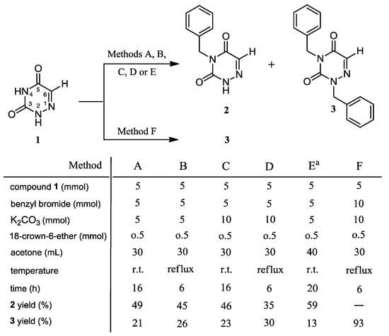 The IUPAC numbering system of compound 1,2,4-triazin-3,5(2H,4H)-dione (6-azauracil; 1), synthesis of the 4-benzyl-1,2,4-triazin-3,5(2H,4H)-dione (2) and 2,4-dibenzyl-1,2,4-triazin-3,5(2H,4H)-dione (3) to afford different yield ratios by different methods. a Benzyl bromide in dry acetone (15 mL), which was added to the flask five times, each time with 3 mL drop by drop in 20 min for 2 h, stirred at room temperature for a total of 20 h.