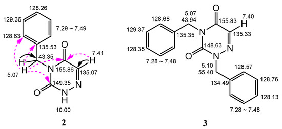 Scheme 2 presents the complete assignment of 1H- and 13C-NMR signals for compounds 2 and 3, together with the corresponding long-range (pink dashed arrow) and short-range (black color) 1H-13C correlations. The δ values of 1H- and 13C-NMR of 1,2,4-triazin-3,5(2H,4H)-dione moiety were similar in 2 and 3. In compound 3, the δ values of the 1H-NMR spectra were very similar between the methylene proton on N-2 benzyl and N-4 benzyl group showed δ values of 5.10 and 5.07 ppm, respectively. On the other hand, the clearly different δ values of the 13C-NMR spectra between the methylene carbon on N-2 and N-4 benzyl groups showed δ values of 55.40 and 43.94 ppm, respectively. Taken together, the δ values of the 1H- and 13C-NMR spectra display the methylene group on N-2 showed significant downfield shifts than the N-4 benzyl group of molecule 3.