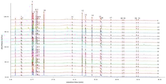 The chromatographic fingerprints of 18 leaf samples of C. paliurus from different geographic locations are presented in Figure 1. The reference fingerprint (marked with R in Figure 1) was developed with the median of 18 chromatograms to identify and evaluate the quality of C. paliurus leaves, and 21 peaks were extracted to be the characteristic common peaks. In general, the characteristic peaks’ selection was based on the criterion that peaks found in each of the chromatograms of samples that originated from different geographic locations were well separated under the given chromatographic conditions, and that they had different relatively large peak areas on different profiles [33].