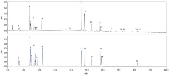 Figure 3. HPLC chromatograms of a representative sample solution (top) and a mixed standard solution containing the 16 quantitative compounds (bottom).