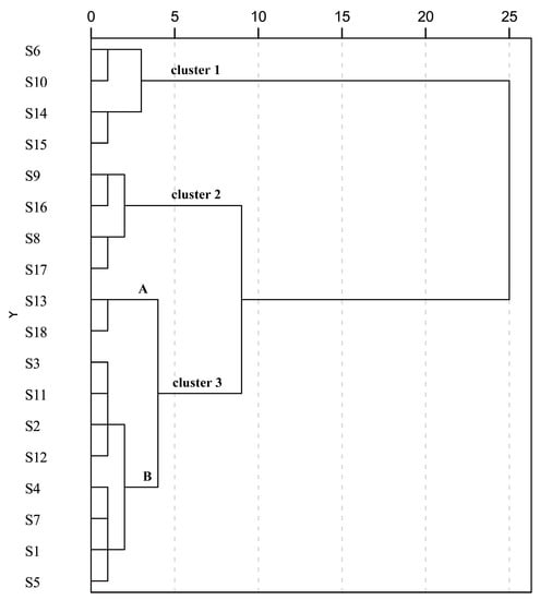 Figure 4. Dendrogram of hierarchical cluster analysis for leaf samples S1–S18 of C. paliurus (detailed geographical information for S1–S18 is listed in Table 1). A and B represent two subgroups under cluster 3 based on the squared Euclidean distance.