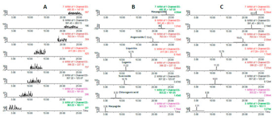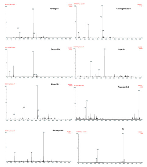Acetonitrile and methanol of HPLC grade were obtained from Merck (Darmstadt, Germany). Formic acid was purchased from Sigma-Aldrich (St. Louis, MO, USA). All aqueous solutions were prepared with ultra-pure water produced from a Milli-Q High Purity Water System (Millipore, Billerica, MA, USA). Other reagents were of analytical grade or higher. Reference standards (purity >98%, Figure 3) of chlorogenic acid (batch No.: 110753-201314), sweroside (batch No.: 111742-201101), loganin, (batch No.: 111640-201005), liquiritin (batch No.: 111610-201106), harpagoside (batch No.: 110786-200503) and linarin (internal standard, IS, batch No.: 110715-200512) were purchased from the National Institutes for Food and Drug Control (Beijing, China). Reference standards (purity > 98%, Figure 3) of harpagide (batch No.: 151221) and angoroside C (batch No.: 16100905) were purchased from Chengdu Pufei De Biological Technology Co., Ltd. (Chengdu, China).