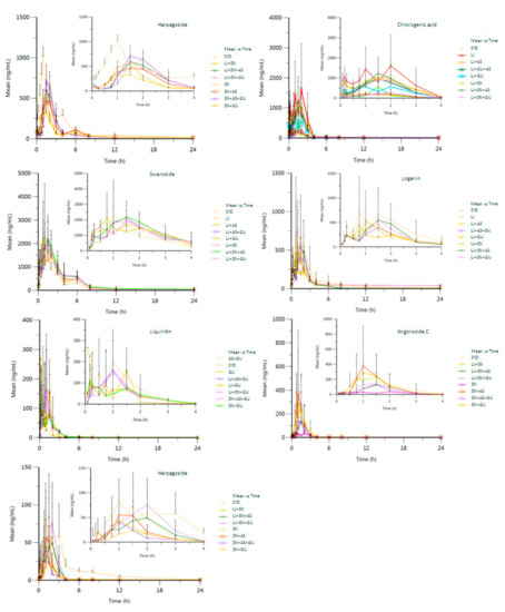 Numerous pharmacokinetic studies have focused on LJ, SN, AS and GU as single herbs. For instance, Zhou et al. [18] established an HPLC-MS/MS method for pharmacokinetic and absolute bioavailability studies of chlorogenic acid from LJ in rats with different administration routes. Luo et al. [19] developed a specific UPLC-MS/MS for the pharmacokinetic study and tissue distribution of AS coupled with other herbs. Li et al. established and applied a new LC-MS/MS method for analyzing the metabolism, distribution, excretion and attenuation mechanism of triptolide from GU in rats [20]. HPLC-MS and pharmacokinetic studies referred to harpagide [21], chlorogenic acid [18], sweroside [22], loganin [23], liquiritin [24], angoroside C [25] and harpagoside [25] have been reported.