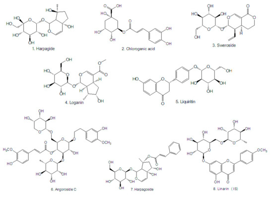 Until now, many types of compounds have been reported in herbs composing SYD [6,7,8,9,10,11], including flavonoids (i.e., liquiritin), iridoids (i.e., harpagide, sweroside, loganin and harpagoside), phenylpropanoids (i.e., angoroside C and chlorogenic acid), terpenoids and others. Among them, chlorogenic acid and liquiritin exhibit various pharmacological activities including antioxidative, antiviral, antibacterial, anti-inflammatory, anti-endotoxin, antitumor and liver protective effects [12,13,14]. Representative iridoids such as harpagide, sweroside, loganin and harpagoside have been reported to exhibit anti-inflammatory, antipyresis, analgesia, anti-virus and liver protection effects [15,16]. Angoroside C has been shown to have an anti-fatigue effect [17].