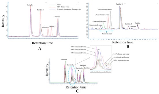 Parishin B and C were well detected in the aqueous phase of the 0.1% formic acid-water combination, but not in the other two aqueous phases (Figure 1A). The peak area of parishin E increased significantly in this condition. Because of this, 0.1% formic acid-water was chosen as the aqueous phase for further analyses.