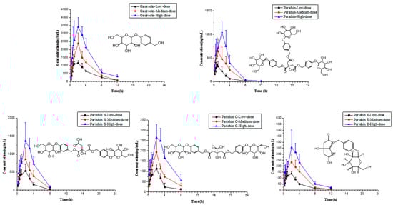 Several previous studies of GE have focused primarily on gastrodin [,,]. However, both parishin and parishin B are also potentially active compounds based on their high concentrations in vivo and should therefore be investigated more deeply at a pharmacological level. At the same time Jiang et al. reported [] that gastrodin can be detected in heart, liver and other tissues, which could be expanded the pharmacodynamics of gastrodin study. Mean plasma clearance (CL) for gastrodin, parishin, and parishin B, C and E was 0.2, 3.14, 0.87, 0.96 and 1.61 L/h/kg, respectively, showing that gastrodin was eliminated more rapidly than any of the other compounds in beagle dogs. The maximum plasma concentration (Cmax) of gastrodin was 1200 ± 120, 2050 ± 495 and 3760 ± 778 ng/mL in the low, medium, and high intragastric administration levels, respectively. Besides, for the three dosage levels, mean residence time from 0 to 24 h (MRT0–t) was 2.98 ±1.01, 3.46 ± 0.29 and 3.54 ± 0.69 h; mean residence time from 0 to infinity (MRT0–∞) was 3.33 ±1.09, 3.80 ± 0.28 and 3.93 ± 0.99 h; and terminal elimination half-life (t1/2) was 1.86 ± 0.67, 1.90 ± 0.26 and 2.09 ± 0.68 h.