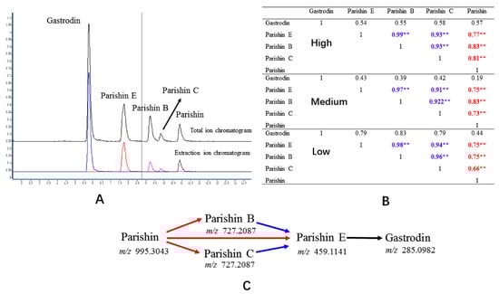 (A) The total ion mass spectrograms and extraction ion mass spectrogram of the potential compounds in beagle plasma after administration of tall Gastrodia capsules; (B) Correlation coefficients of five compounds (** represents p < 0.01); (C) Putative pathway from parishin to gastrodin in vivo.