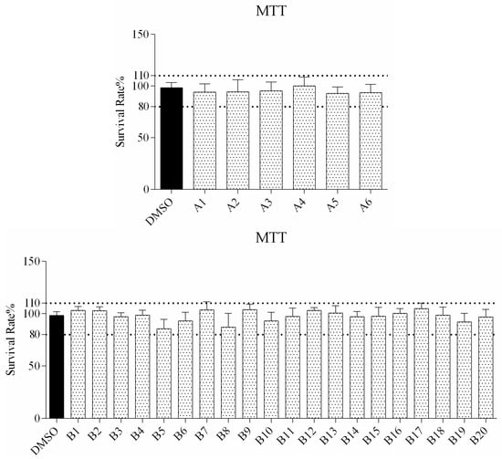 In vitro survival rate of RAW264.7 cells treated with compound A1–6 and B1–20 at 160 μM.