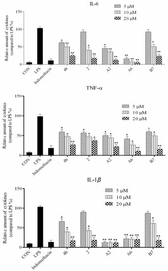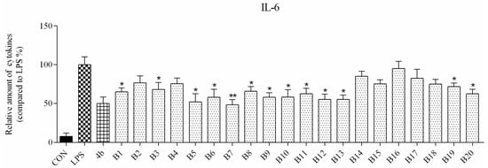 Relative levels of cytokine IL-6 in macrophages after treatment with compounds A1–6 and B1–20 at 10 μM concentration as compared to LPS group and indomethacin group (*: p < 0.05; **: p < 0.01).