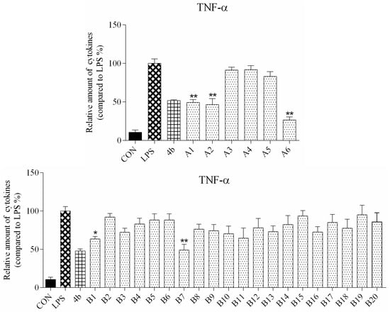 Relative levels of cytokine TNF-α in macrophages after treatment with compounds A1–6 and B1–20 at 10 μM concentration as compared to LPS group and indomethacin group (*: p < 0.05; **: p < 0.01).