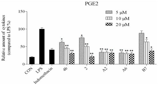 Compounds 4b, 2, A2, A6, and B7 reduced the production of IL-6, TNF-α, IL-1β, and PGE2 at concentrations of 5 μM, 10 μM, and 20 μM (*: p < 0.05; **: p < 0.01).