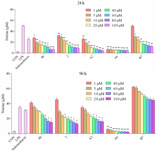 It has been well established that NO production is correlated with various inflammatory diseases. We investigated the suppressive effects of compounds 4b, 2, A2, A6, and B7 on NO levels in macrophages stimulated with LPS. The supernatant was treated with a range of concentrations (1–100 μM) of compounds for 1 h followed by stimulation with LPS for 24 h and 96 h, and NO production was measured using Griess reagent. It was found that compounds 4b, 2, A2, A6, and B7 dramatically inhibited the release of NO in a dose-dependent manner following LPS stimulation (Figure 5). The effects at 24 h were more significant compared to 96 h. In particular, compound A6 displayed higher inhibitory activity when compared with the positive control indomethacin at 1 μM.