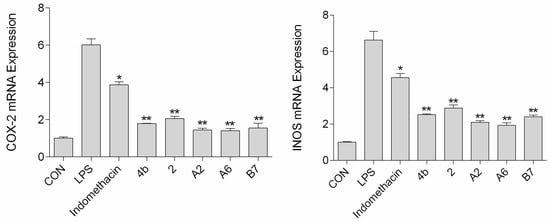 The expression of COX-2 and iNOS mRNA after treatment with 10 μM compound 4b, 2, A2, A6, B7, or indomethacin (*: p < 0.05; **: p < 0.01).