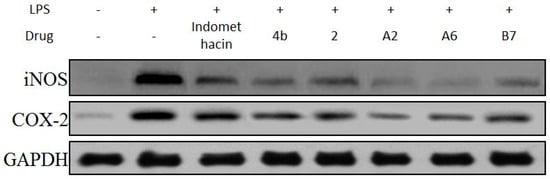 Immunoblotting of cellular proteins COX-2 and iNOS expression in RAW264.7 cells treated with 10 μM compounds 4b, 2, A2, A6, B7, or indomethacin. GAPDH was used as a loading control.