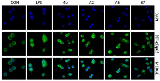 Immunofluorescence of NF-κB p65 in RAW264.7 cells exposed to LPS (100 ng/mL) with or without compound 4b, A2, A6, and B7 (10 μM).