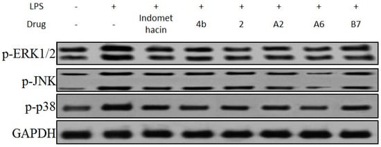 Immunoblotting of p-ERK1/2, p-p38, and p-JNK of MAPK signaling pathway in RAW264.7 cells treated with 10 μM compound 4b, 2, A2, A6, and B7, or indomethacin. GAPDH was used as a loading control.