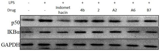 Immunoblotting of p50 and IKBα of NF-κB signaling pathway in RAW264.7 cells treated with 10 μM compound 4b, 2, A2, A6, B7, or indomethacin. GAPDH was used as a loading control.