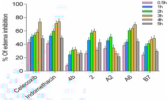 In the rat paw edema model, both the compound group and positive control group showed reduction of carrageenan-induced rat paw edema at varying levels (Figure 11). Compounds A2, A6, and B7 displayed improved activity compared to 4b, with A6 exhibiting the highest in vivo activity among the three new analogs, comparable to celecoxib and indomethacin. Based on all results, A6 can serve as a lead compound for further studies.
