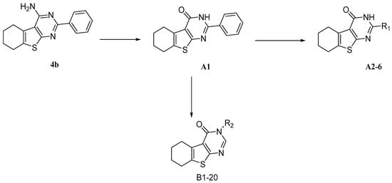 Previously, during the study of tetrahydrobenzo[4,5]thieno[2,3-d]pyrimidine series of fibroblast growth factor FGFR1 inhibitors, we were intrigued by the findings that compounds such as 4b (Scheme 1) inhibited the production of TNF-α and IL-6 [29]. In the literature, it is known that compounds with a similar thieno[2,3-d]pyrimidine scaffold has been reported as anti-inflammatory agents [30,31]. In addition, as a bioisostere of quinazoline, thieno[2,3-d]pyrimidine has been used extensively for a pharmacophore and synthesis of compounds with diverse biological activities, including anti-tumor [32,33,34,35,36,37,38], anti-microbial [33,39], anti-viral [40,41,42], anti-diabetic [43], anti-anxiolytic [44], and antioxidant [45] activities. We therefore set out to explore the potential anti-inflammatory activity of 4b, the tetrahydrobenzo[4,5]thieno[2,3-d]pyrimidine compound; however, the activity of 4b has room for improvement, so we attempted to change the amino into carbonyl to obtain the compound A1, possessing hydrogen bond receptor to improve the binding between compounds and inflammatory cytokine. According to preliminary anti-inflammation activity screening, A1 is superior to 4b (51.64% and 49.83% for anti-IL-6, as well as 50.70% 48.23% for anti-TNF-alpha). Furthermore, we performed further structural modifications to A1 at 2 and 3 positions, respectively, to get compounds with better anti-inflammatory activity and to study the underlying molecular mechanisms of this novel class of compounds.
