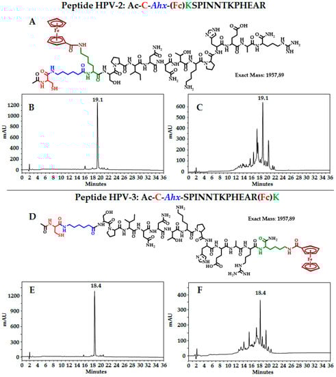 Peptides derived from Human Papillomavirus L1 protein (HPV L1). Both sequences contain (i) a cysteine residue (in red); (ii) an aminohexanoic residue (in blue); (iii) lysine residue (in green); and (iv) the ferrocene motif (in brown). Structure of peptide HPV-2: (A) reverse phase high performance liquid chromatography (RP-HPLC) profile of the purified product (B) before, and (C) after the lyophilization process. Structure of peptide HPV-3: (D) RP-HPLC profile of the purified product (E) before and (F) after the lyophilization process.